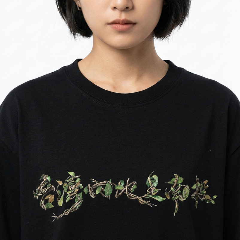 捨棄了傳統的印刷字體,改以繁複的枯枝、藤蔓與生機盎然的綠葉交織構成。